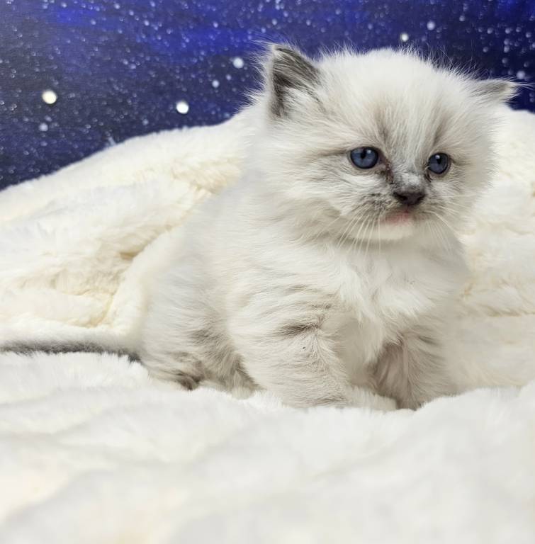 Bicolour, Mitted, and Colourpoint Ragdolls with the classic soft coat and bright blue eyes.
